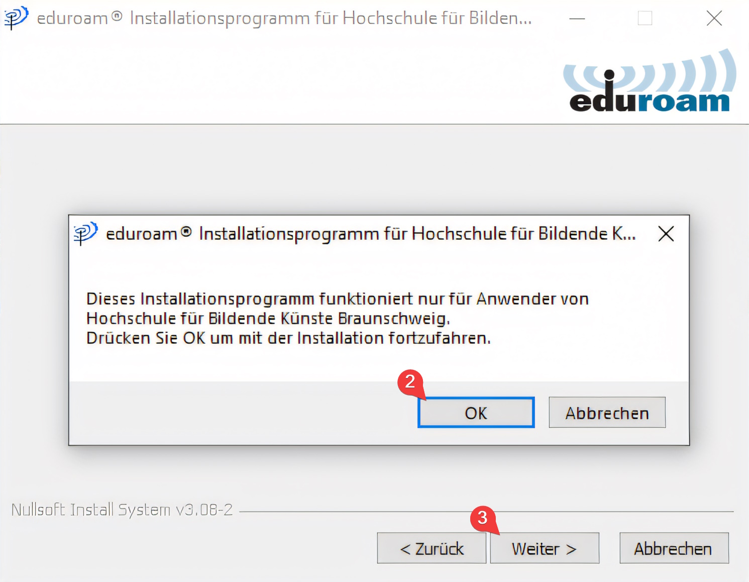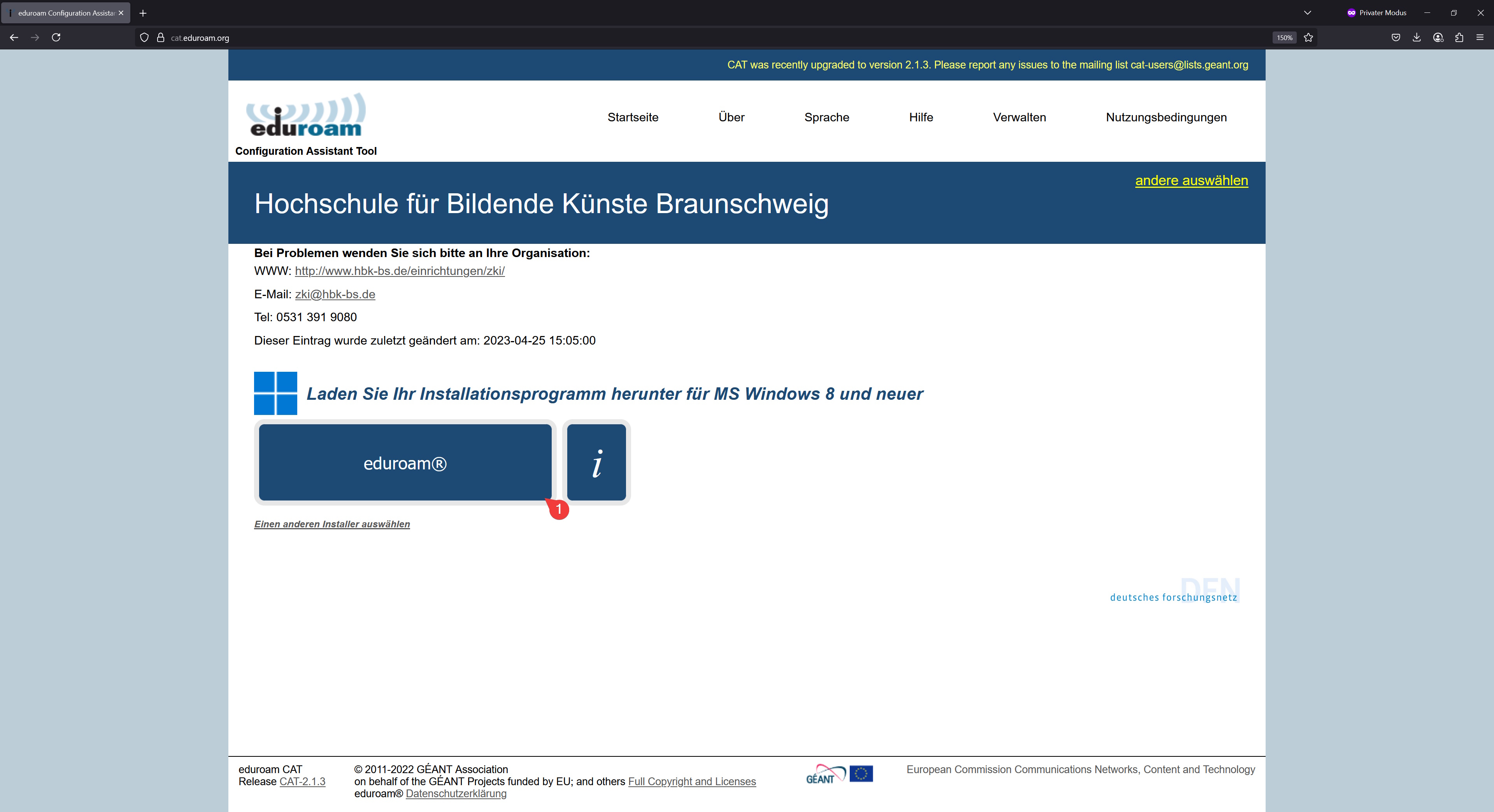- Das Eduroam Installationsprogramm gibt keine Fehlermeldung aus, wenn der falsche Benutzername oder Passwort eingegeben wird.