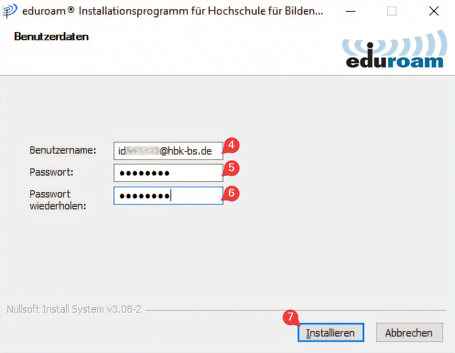 Hinweis: Die Formatierung des Benutzernamens lautet id••••••@hbk-bs.de