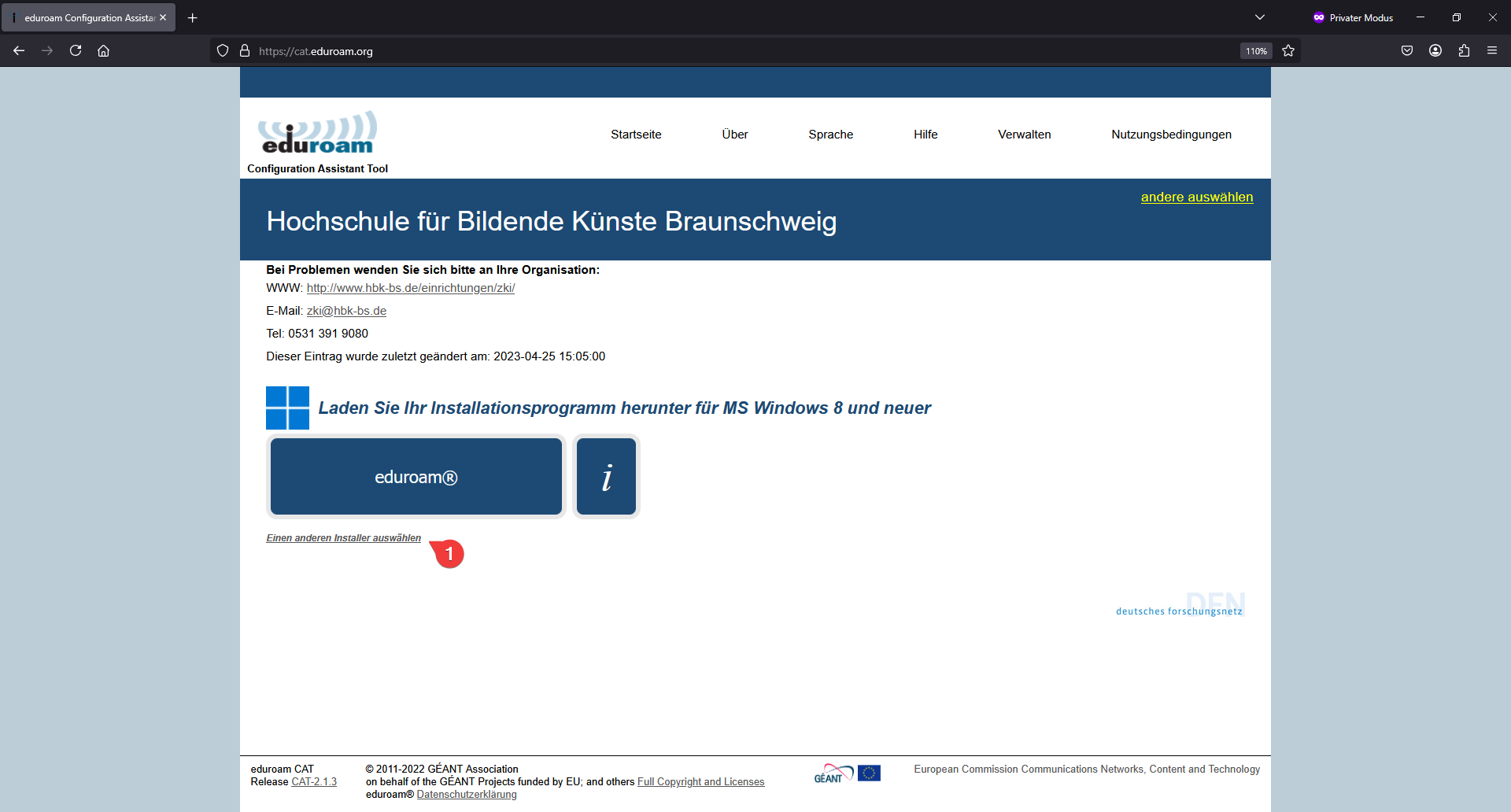 → Sollte die entsprechende Version nicht ausgewählt sein, klicken Sie auf „Einen anderen Installer auswählen“ unterhalb des großen „Eduroam“-Button.